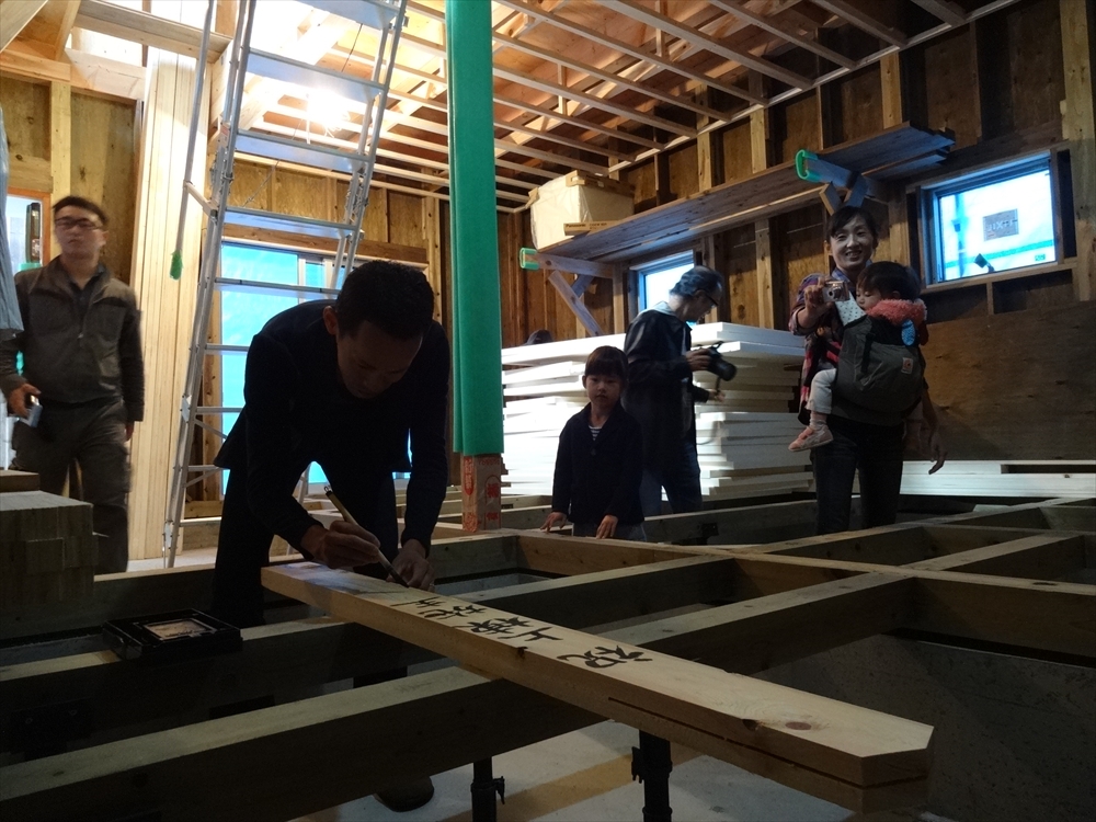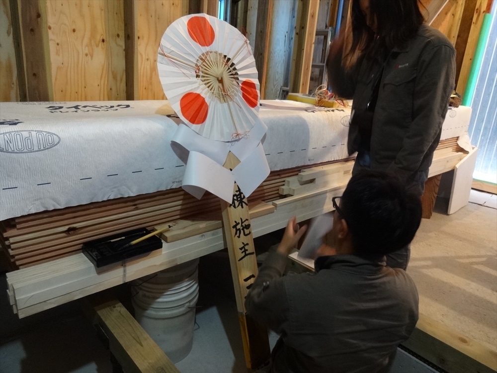 緊張の中、奥様・お子様の見守る中、M様も御幣に筆入れ、