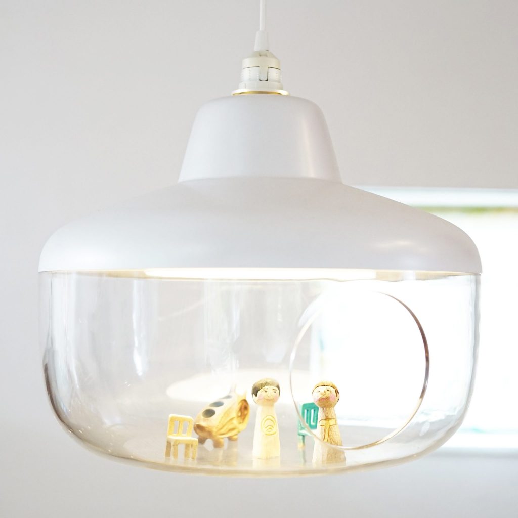 OWNERS-FAVORITE #LIGHTING照明 FAVORITE THINGS FAVORITE THINGS(フェイバリット シングス)は、ガラスシャードの中に宝物を飾ることができるペンダントライト。2人のお子様の木彫り人形は、彫刻家・北浦和也氏の作品だ。そのほか、いきつけのカフェのミニチュアチェアや、岡本太郎の「犬の植木鉢」が仲良く並んでいる。 このアイテムのある暮らし