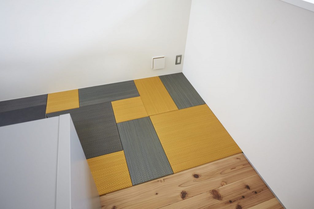 国産のイ草を使ったデザイン性豊かな置き畳、OKI TATAMO。7色のカラフルなラインナップがある中でKさまご夫妻は、ブルーグレーとサフランイエローをチョイス。床の間のようなスペースを作ろうと計画中。用途に合わせて増やしたり減らしたりできるのも便利。