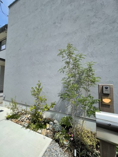 グレーの外壁に植栽の緑が映えてとても素敵です◎