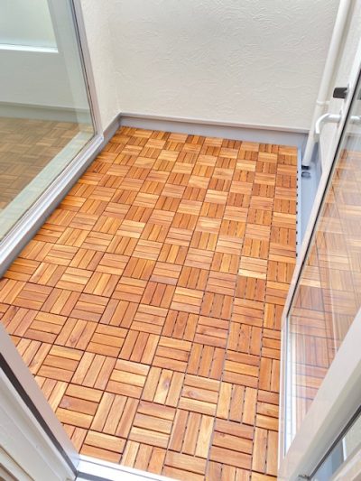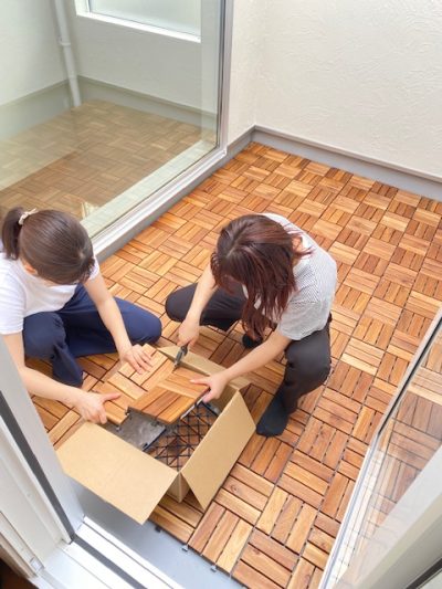 △山田&升田の若者チームはバルコニーに敷くウッドパネルを施工中。