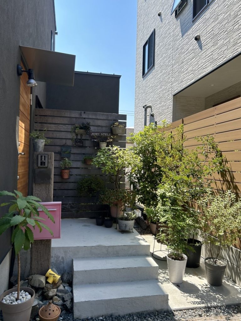 玄関ポーチも植物が沢山置かれていて美しいです。