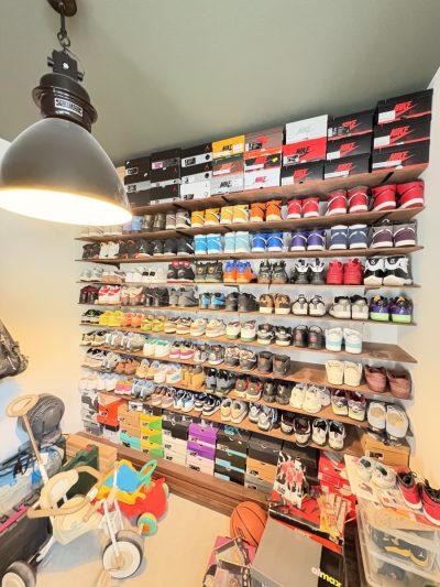 1階土間ハナレをご主人の趣味であるナイキシューズのコレクション兼収納スペースにされておられます。
