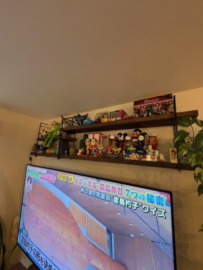 壁掛けテレビ上部やキッチン笠木の上などにフィギアを置かれています。