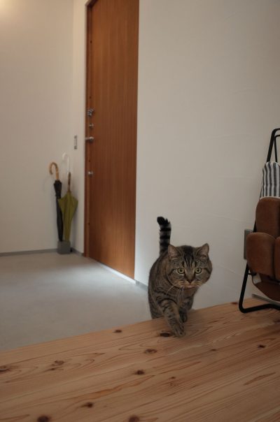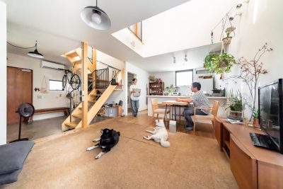 土間は、暑い夏の避暑地として活躍し、冬は、テラスや掃き出し窓から差し込む日のあたる無垢床が、日向ぼっこにうってつけです。またスリット階段は猫の格好の遊び場で、大きな吹き抜けでは小鳥が自由自在に行来を繰り返します。