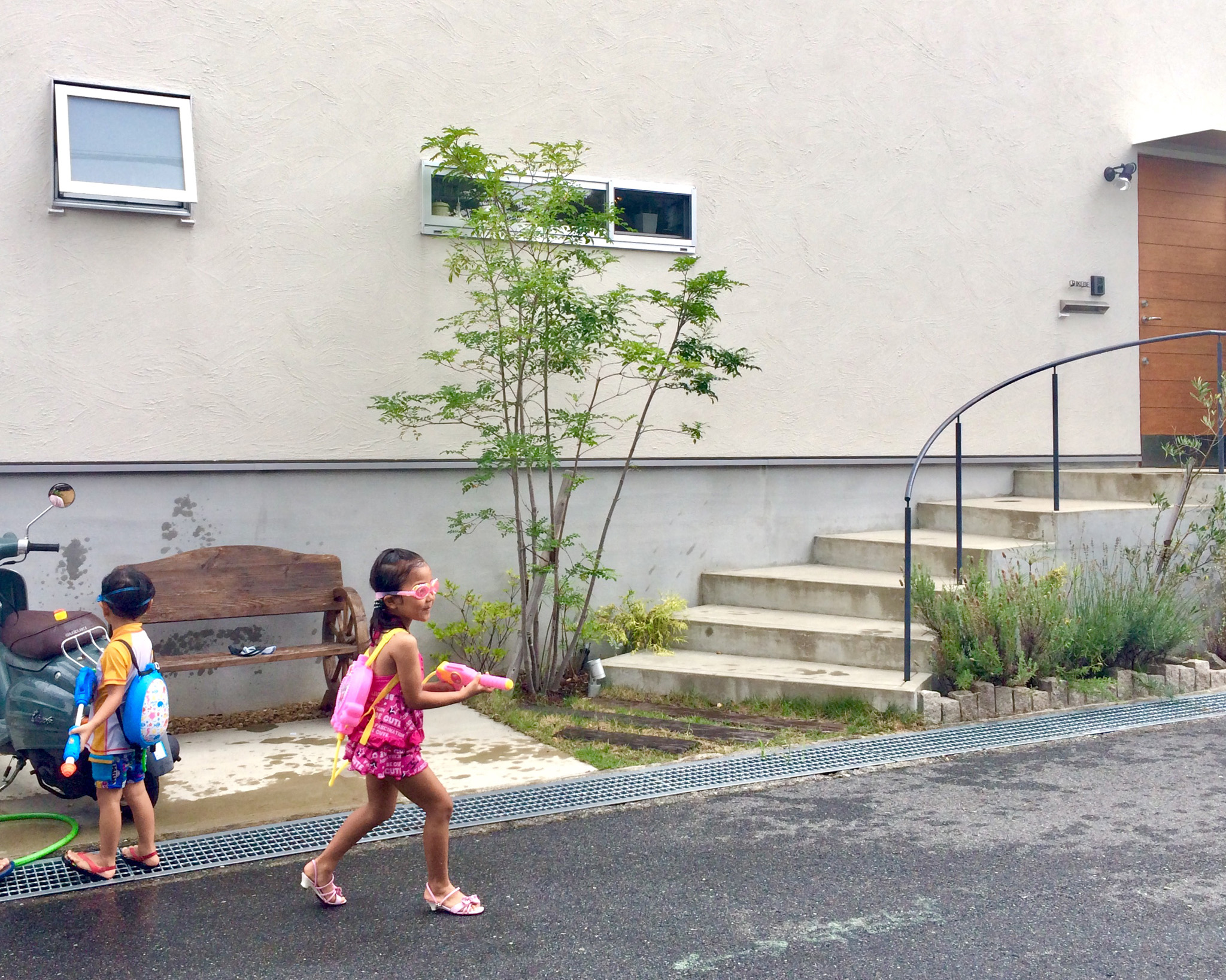 暑い日は、とりあえず家の前で水遊び。近所の子たちも集まってきて、結局、大人も毎回ビチョビチョ…涙