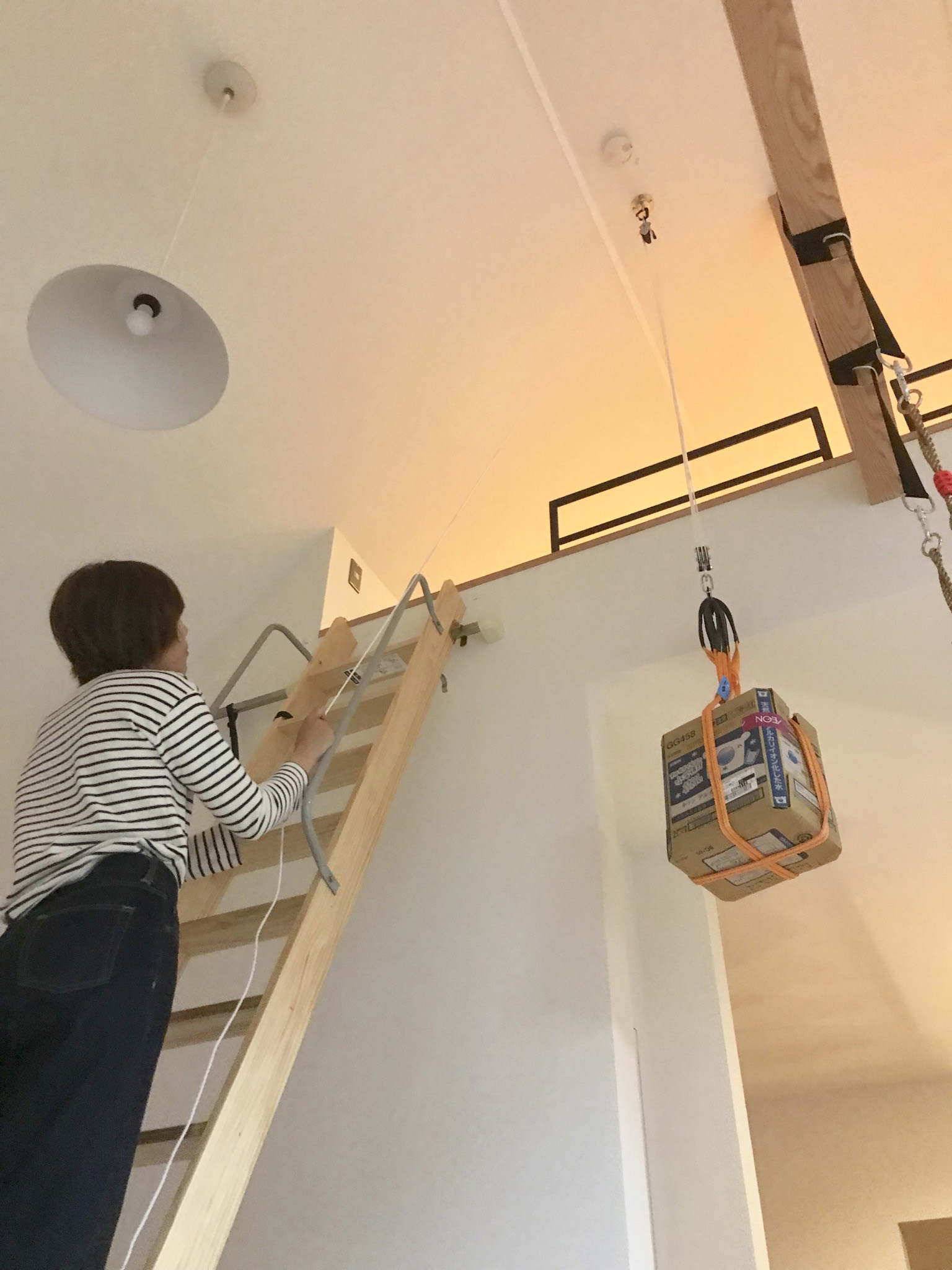 2階天井にハンモック吊り金具を設置。そこに滑車を取り付けて重量物をロフトに上げるときに使ってます。