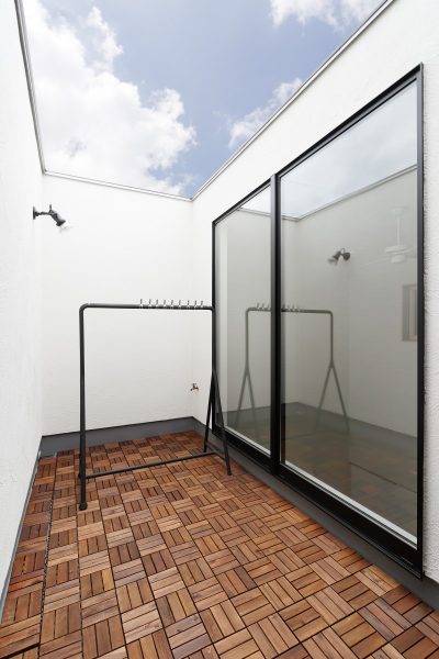 WOOD&GREEN が映える白い家。