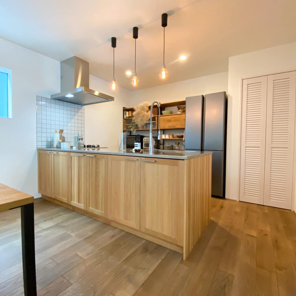 リビングから冷蔵庫の中が見えるのが嫌だったので、キッチンの奥に冷蔵庫を設置したいと思っていたけれど、営業マンから「冷蔵庫はキッチンの入り口側に設置した方が良い」と勧められ、その通りにした。