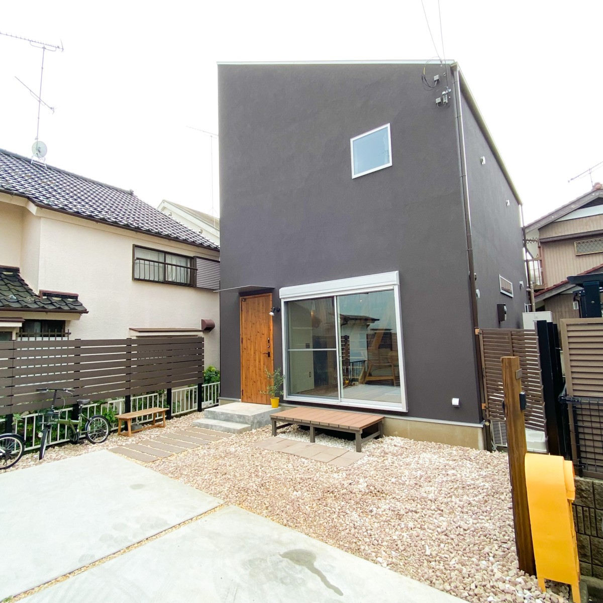 夫:ブラウンの外壁にシルバーの窓枠でアクセントをつけた外観デザインも気に入っています。