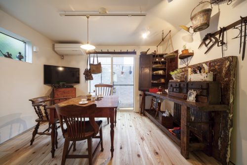 夫:僕は10代の頃からアンティークが好きで、少しずつ買い集めてきた家具や小物が似合う家をイメージしていました。そのためにも漆喰の壁や無加工の無垢床とか、素材にこだわりたいと。土間にも憧れていました。