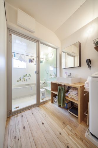 夫:洗面室が広いので子どもとお風呂に入るのもラク。標準仕様のガラス張りのお風呂を最初に見た時には「えっ?」って思ったけど、子供の様子が見られるので安心です。